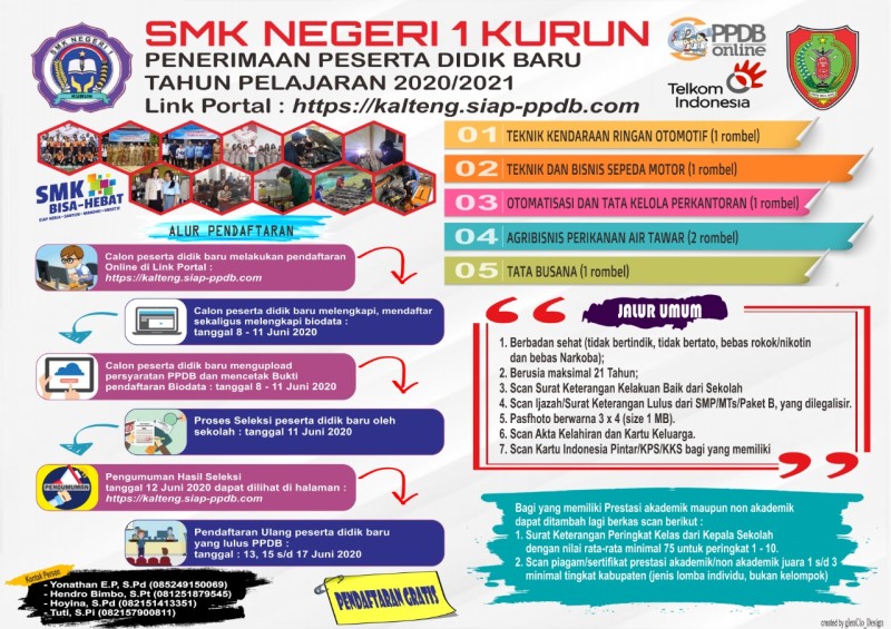 Penerimaan Peserta Didik Baru SMK Negeri 1 Kurun dilaksanakan secara online melalui Link Portal : https://kalteng.siap-ppdb.com